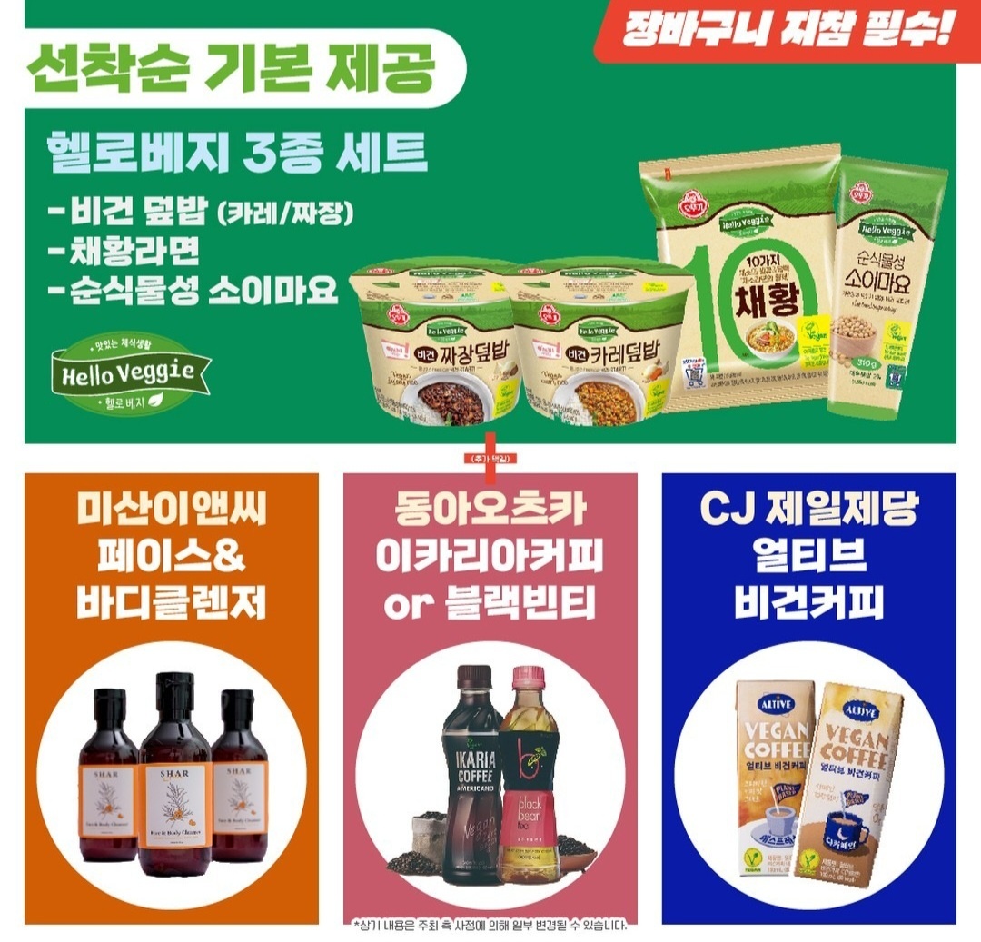 선착순 기본 제공 : 오뚜기 채황라면, 오뚜기 카레/짜장 비건 덮밥, 순식물성 소이마요